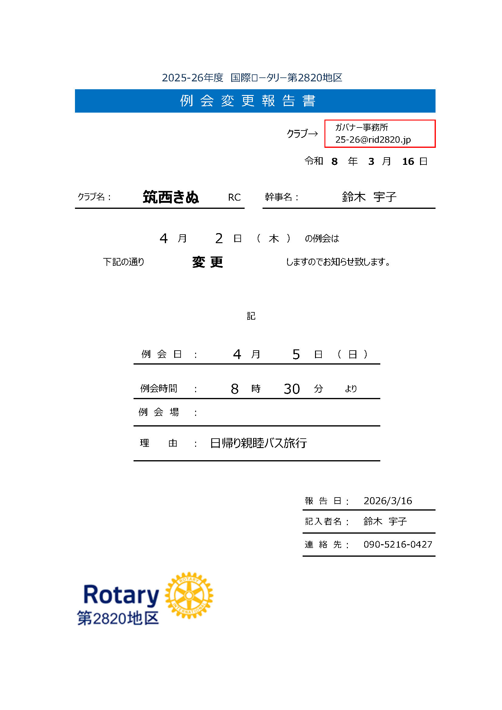 親愛なる2820地区の皆様
