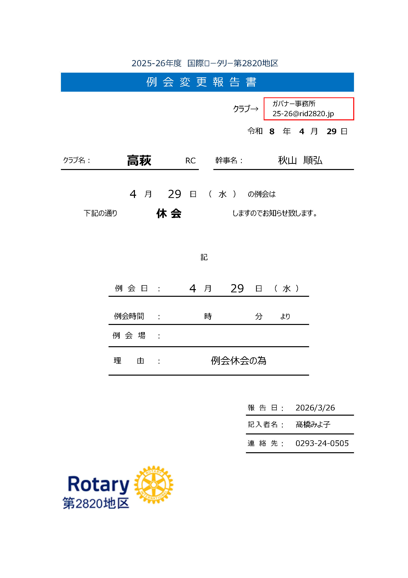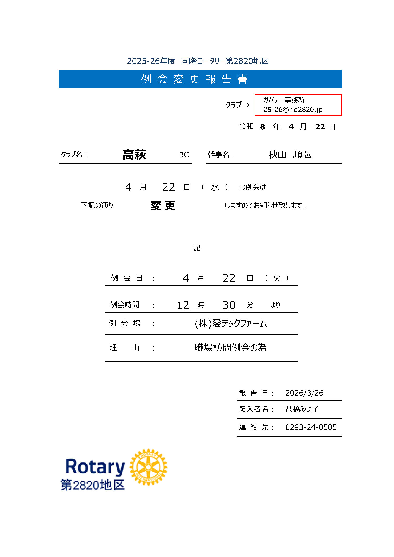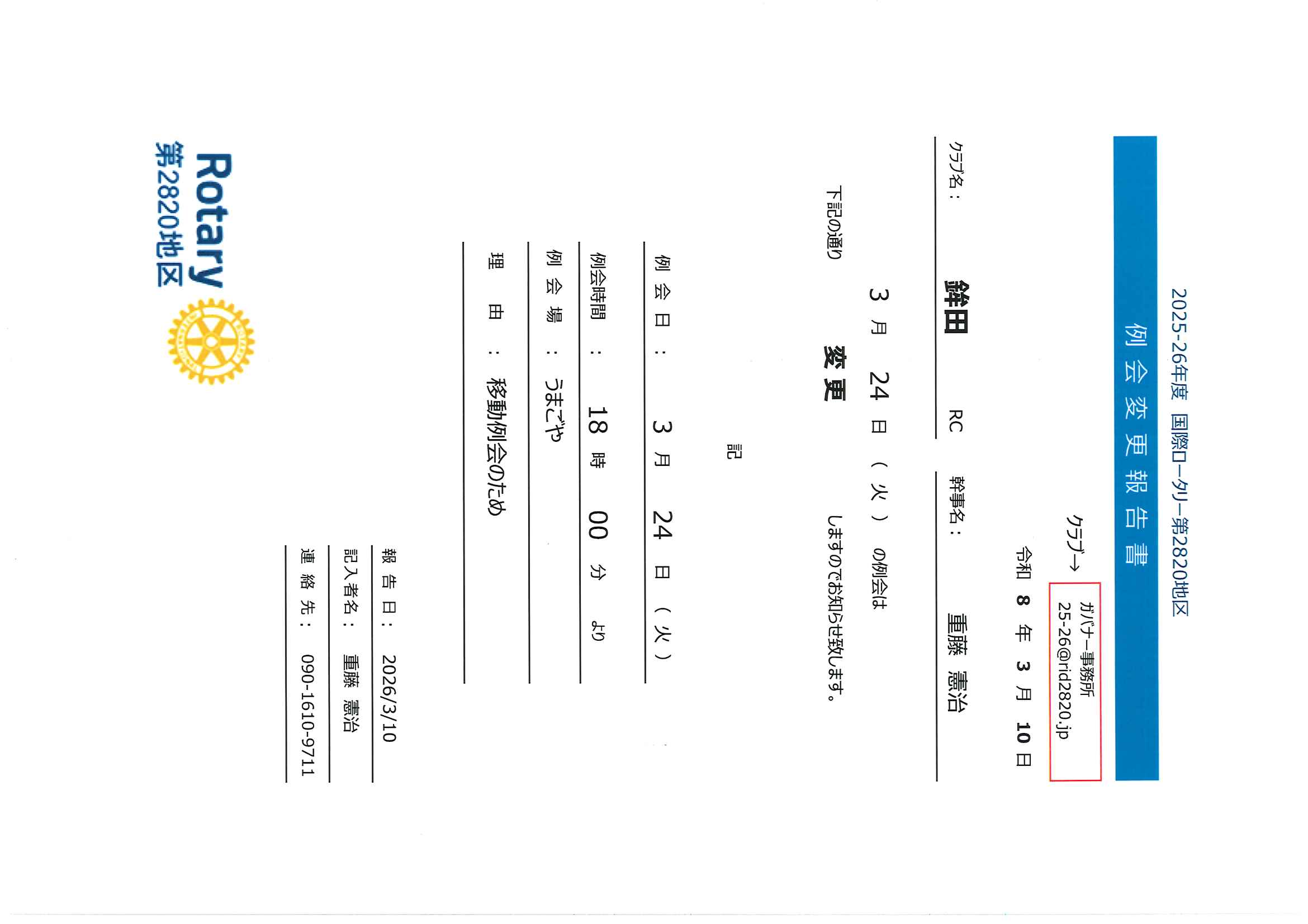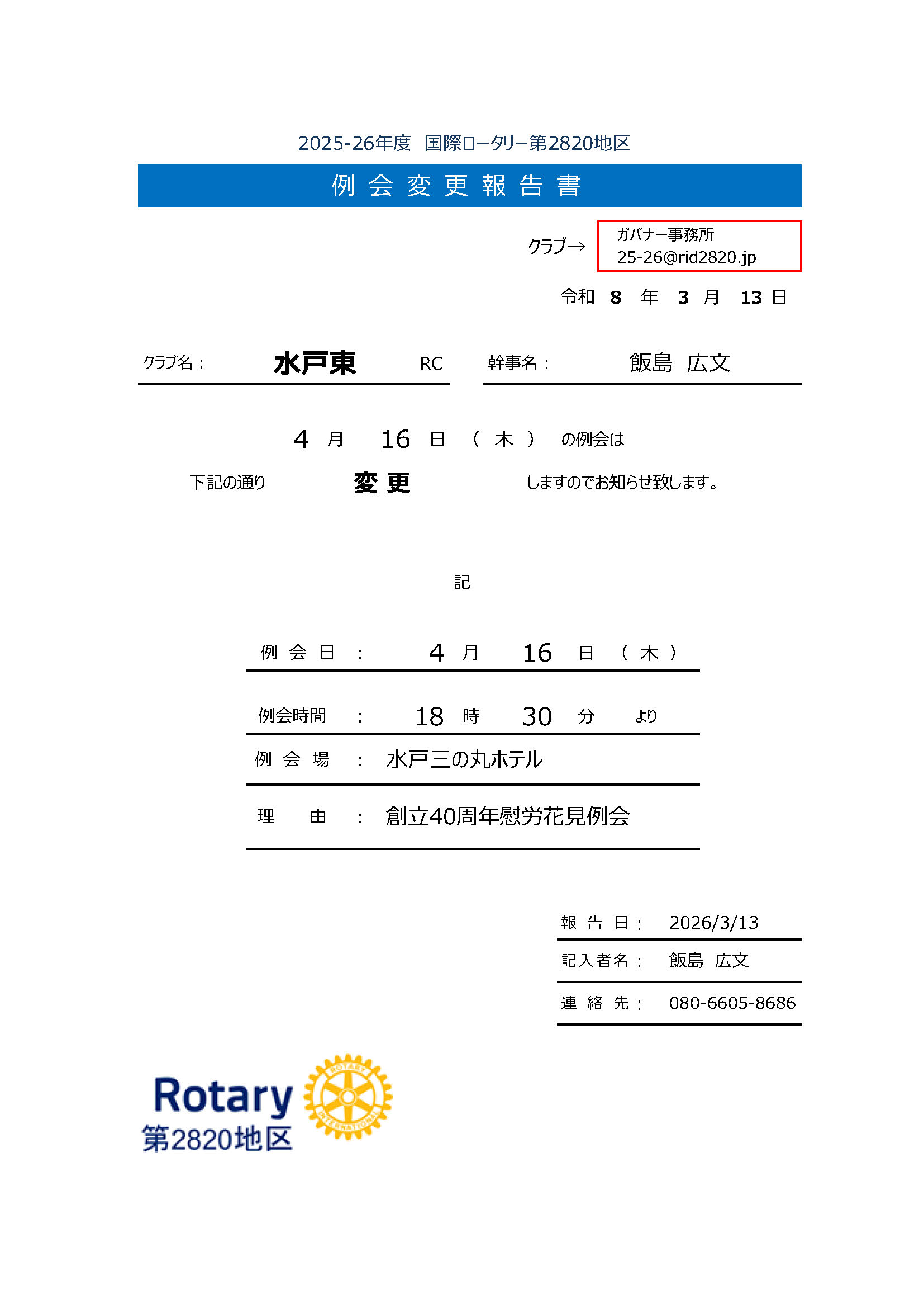 2026年3月より水戸西RCの例会場が変更になっています。